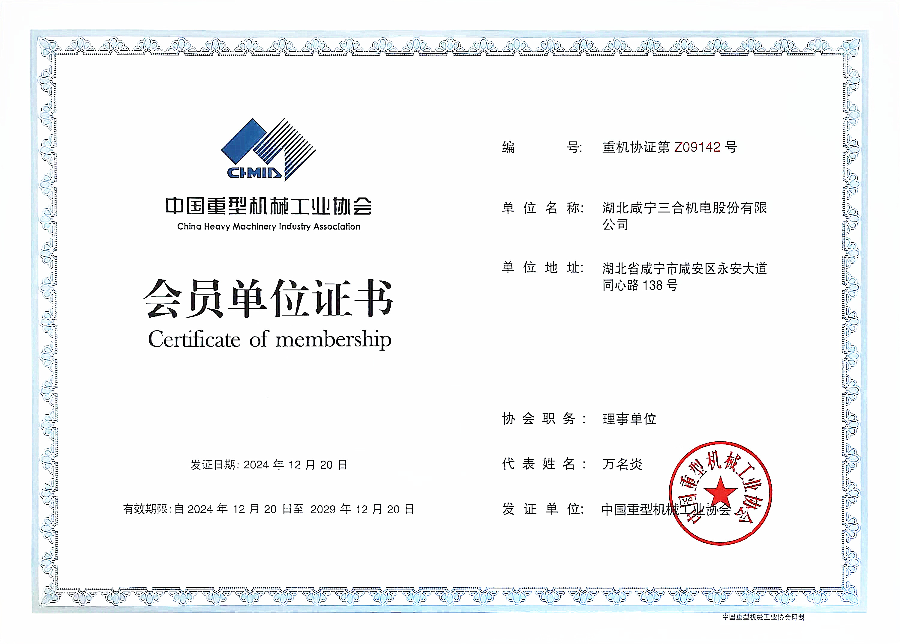 中國重型機(jī)械工業(yè)協(xié)會理事單位證書