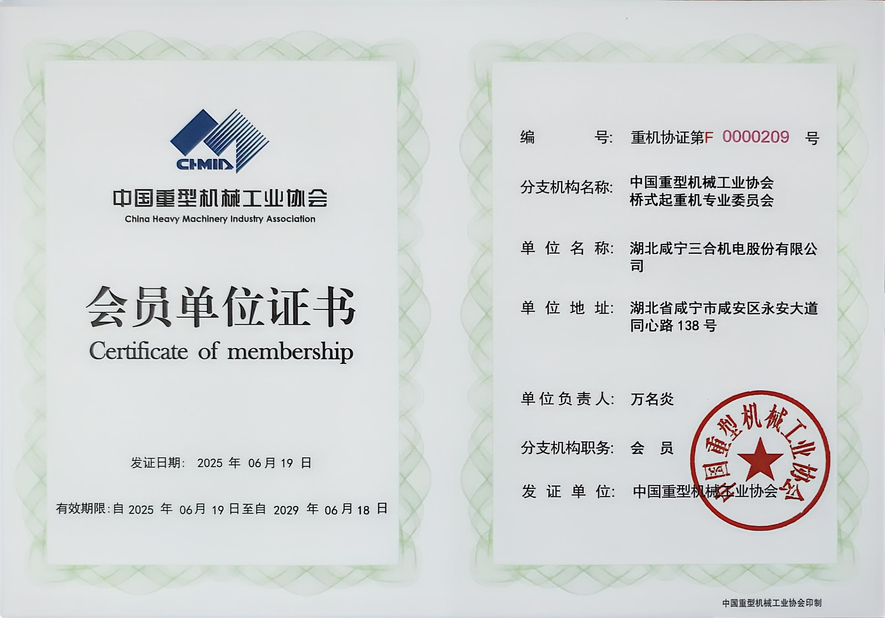 中國重型機械工業(yè)協(xié)會橋式起重機專業(yè)委員會會員單位證書